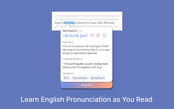 Phonaify adalah add-on untuk browser Chrome yang dirancang untuk membantu pengguna meningkatkan kemampuan pengucapan bahasa Inggris mereka secara efektif. Dengan fitur-fitur yang memungkinkan pengguna untuk mendengarkan pengucapan kata dan mendapatkan umpan balik instan, Phonaify menjadikan pembelajaran bahasa Inggris lebih interaktif dan menyenangkan. Pengguna dapat dengan mudah menyoroti kata-kata di halaman web mana pun dan mendapatkan akses cepat ke informasi pengucapan tanpa harus meninggalkan halaman yang sedang dibaca.